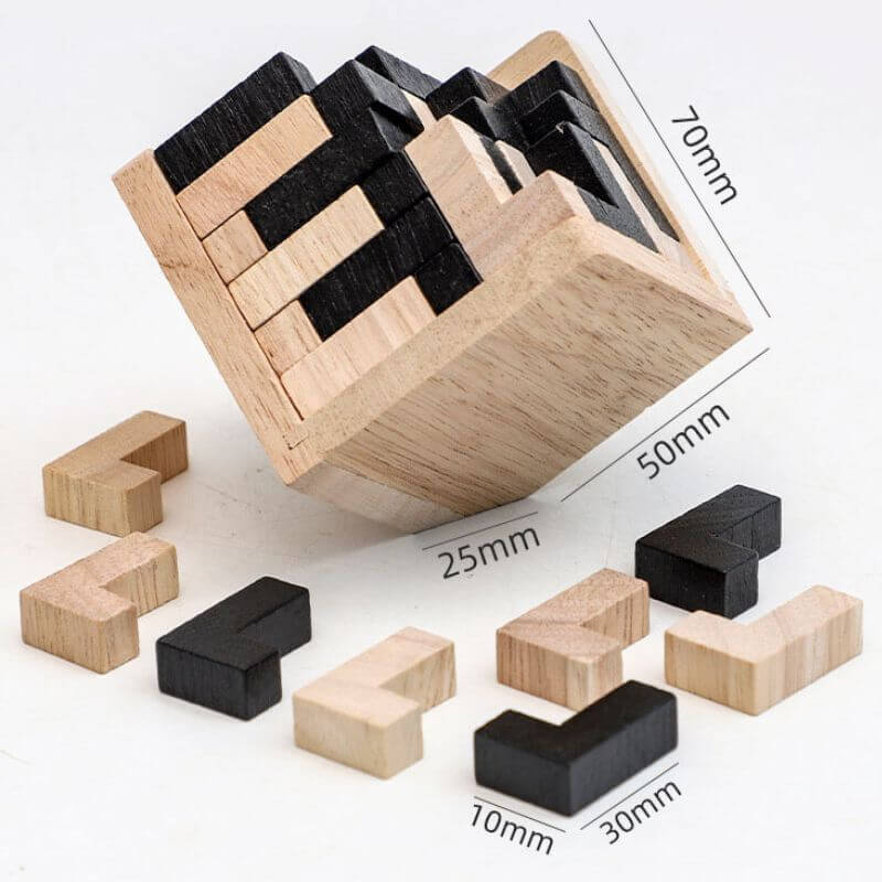 Tauchen Sie ein in eine Welt des Denkens und der Strategie mit unserem Knobelwürfel. Dieses Holzpuzzle ist eine echte Herausforderung für Ihren Verstand. Jedes Teil des Knobelwürfels ist so gestaltet, dass es Ihre Logik und Geduld auf die Probe stellt. Das Ziel? Alle Elemente so zusammensetzen, dass ein perfekter Würfel entsteht. Doch lassen Sie sich nicht täuschen: dieser Holzwürfel ist komplexer, als er auf den ersten Blick wirkt. Jeder Zug zählt, und jedes Teil muss exakt an seinen Platz.