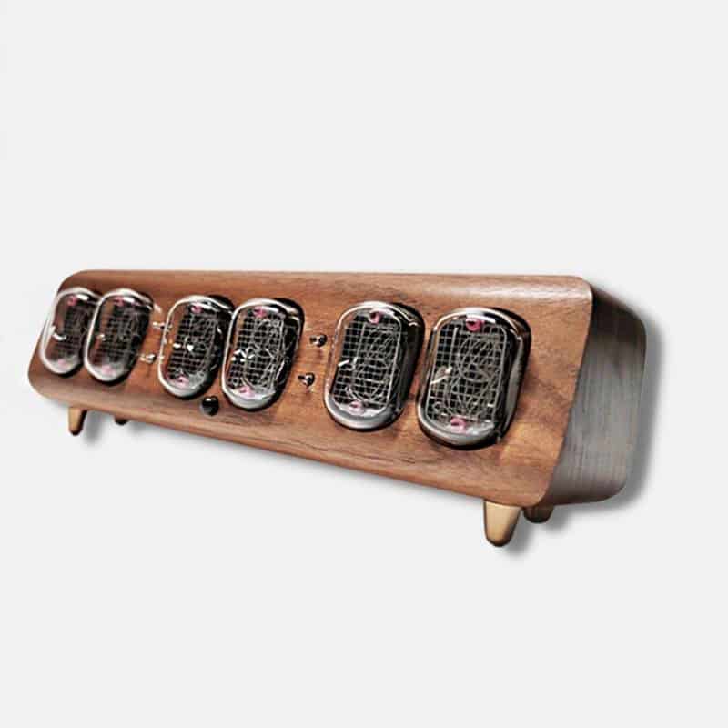 Jeder Aspekt des Designs dieser Retro Nixie-Uhr wurde mit großer Sorgfalt durchdacht, um Ihnen ein vollständiges Eintauchen in die Ästhetik der 80er Jahre zu ermöglichen. Das Gehäuse, das an alte Radios und Nachttischwecker erinnert, sowie die eingelassenen Röhren tragen dazu bei, den unverwechselbaren Vintage-Charme zu bewahren. Diese Retro Nixie-Uhr ist mehr als ein Zeitmesser: sie ist ein echtes Sammlerstück für Liebhaber besonderer Accessoires.