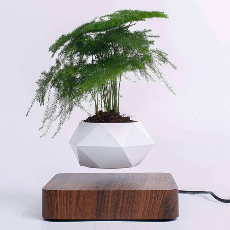 Ein schwebender Designer-Blumentopf vereint Technik und Eleganz in einem einzigartigen Wohnaccessoire. Der steckerfertige Blumentopf besitzt einen elektromagnetischen Eichenboden, auf dem der Topf dank integrierter Magnete frei schwebt. Die Pflanze rotiert automatisch um 360°, sodass sie aus jedem Winkel perfekt zur Geltung kommt. Zudem schützt der Topf die Wurzeln Ihrer Pflanzen und ist insektenresistent, ideal auch für kleine Räume.